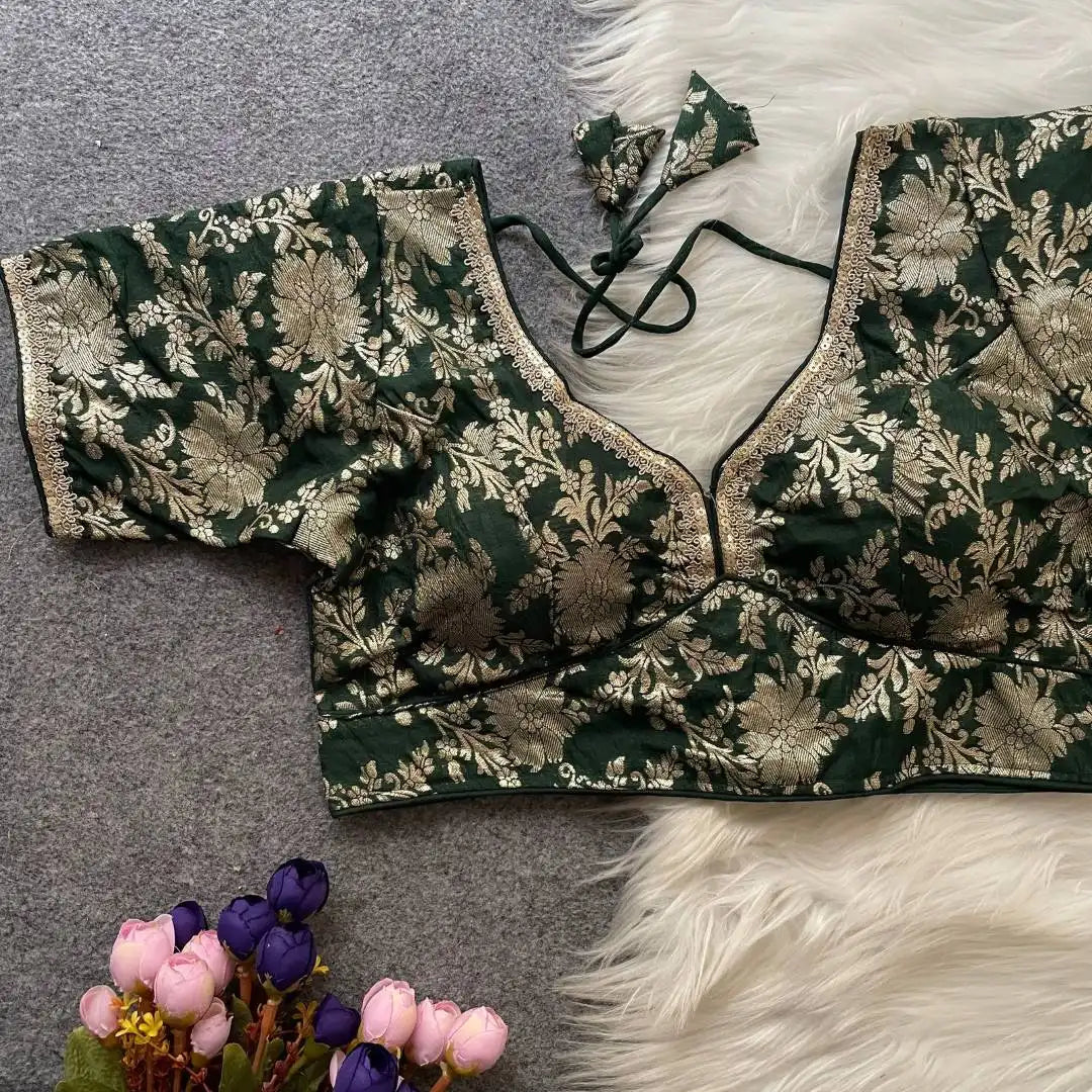 Blouse: | Pure Dola Silk With Golden Weaving | Work :- Less Sequence n Zari Work Golden | Sleeve :- 10 inch | Lining :- Cotton Astar | Open :- Back With Hook n Roop | Pattern :- V Neck | Pad :- Yes Padded |