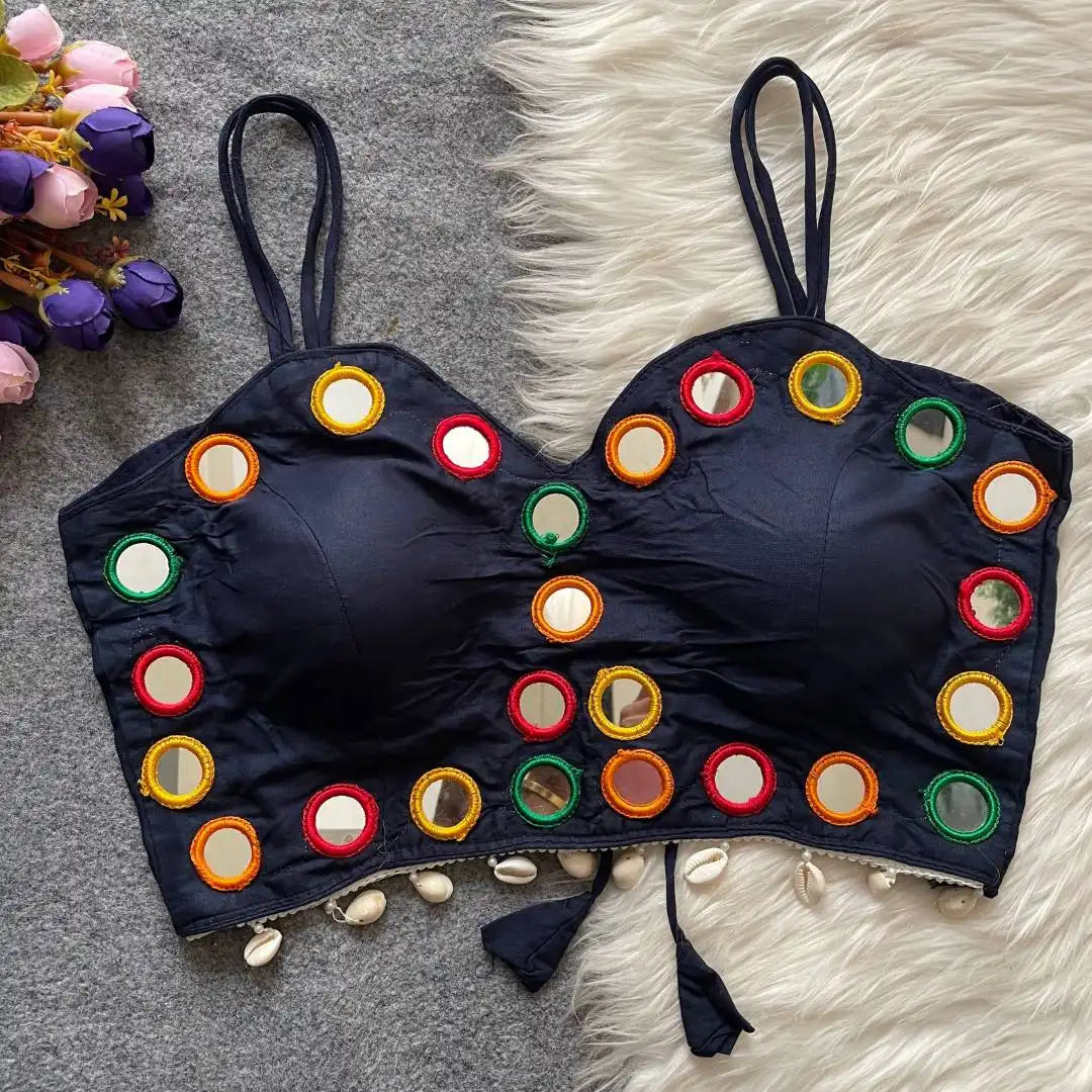 Blouse: | Magic Cotton | DESGINE:- Beautiful Look Real kodi and Real Mirror Works Blouse Design,Heavy Stitching,Heavy Padded (Back Open) | SLEEVES:- sleeve less | ASTER QUALITY:- Cotton |