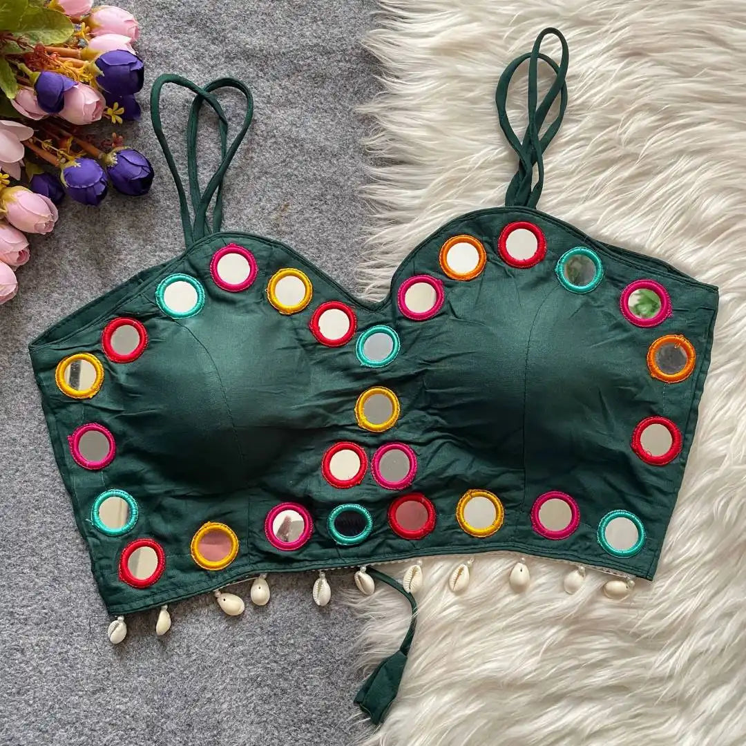 Blouse: | Magic Cotton | DESGINE:- Beautiful Look Real kodi and Real Mirror Works Blouse Design,Heavy Stitching,Heavy Padded (Back Open) | SLEEVES:- sleeve less | ASTER QUALITY:- Cotton |