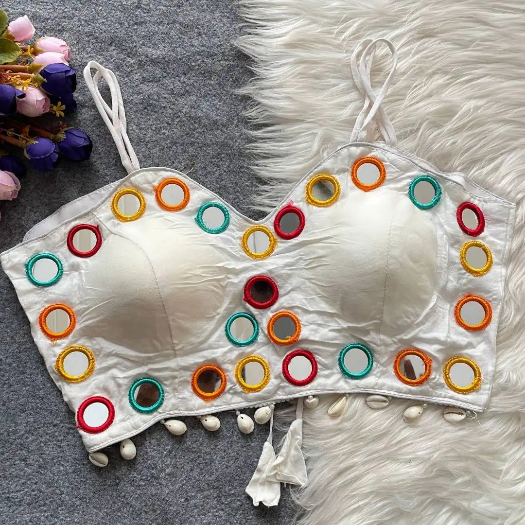 Blouse: | Magic Cotton | DESGINE:- Beautiful Look Real kodi and Real Mirror Works Blouse Design,Heavy Stitching,Heavy Padded (Back Open) | SLEEVES:- sleeve less | ASTER QUALITY:- Cotton |